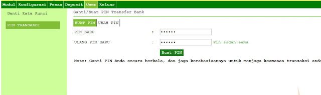 Jika sebelumnya sudah pernah membuat/memiliki PIN transaksi, maka silahkan update PIN tersebut di menu “UBAH PIN” tapi jika belum punya PIN maka silahkan Klik menu “BUAT PIN”