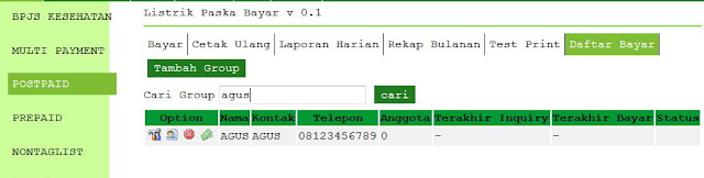 1. Masih di menu postpaid, daftar bayar, silakan cari nama grup yang anda buat sebelumnya. masukan nama grup di kotak cari grup, klik cari.